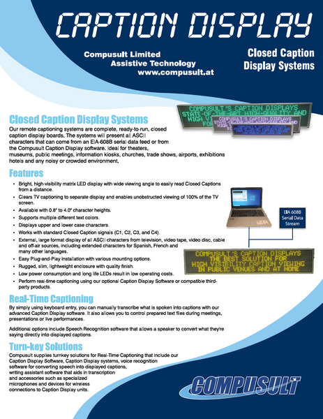 Compusult provides turn-key solutions for Real-Time Captioning that includes our Caption Display Software, Caption Display systems, voice recognition software for converting speech into displayed captions, writing assistant software that aids in transcription and accessories such as specialized microphone and devices for wireless connections to Caption Display units.